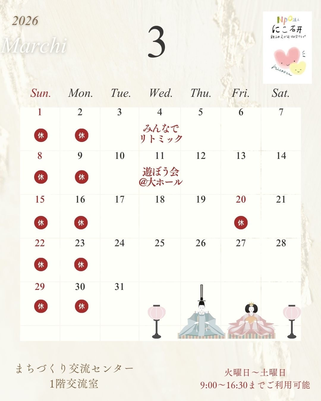 (休館:日曜日・月曜日・祝日・月曜日が祝日の場合は翌火曜日)